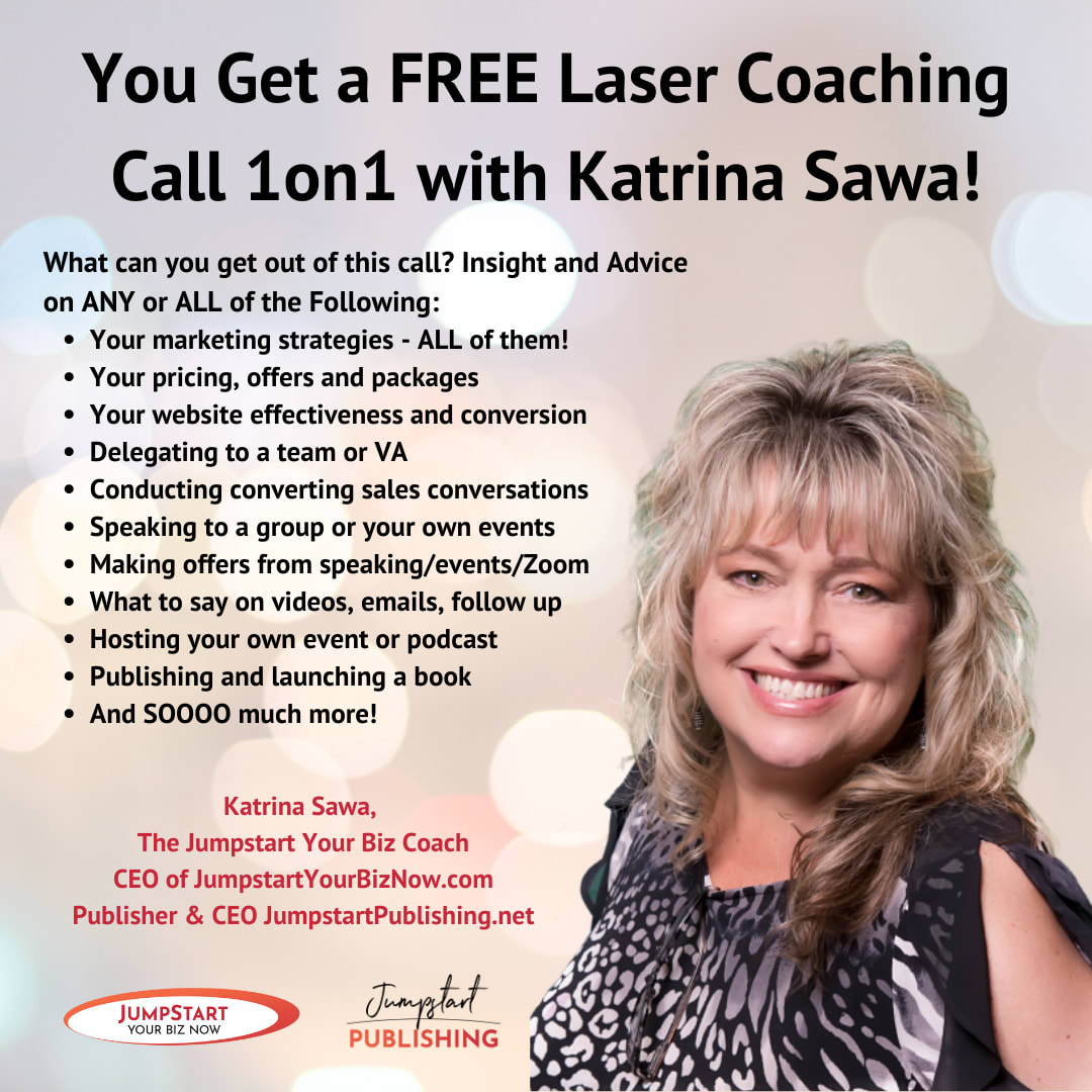 Hi, I’m Katrina Sawa... a Speaker, 14x Int’l Best-Selling Author with 22 books and known as the Jumpstart Your Biz Coach... I love motivating, educating and inspiring entrepreneurs on how to jumpstart their businesses, make more money, tweak and shift what you’re doing right now or how to do things differently so you can be more productive, profitable and impactful.